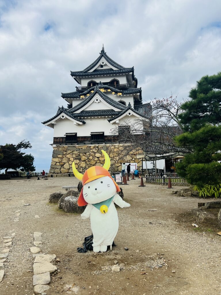 彦根城をバックにかわいらしいひこにゃん。皆お気にいりの角度で写真撮影をしていました。