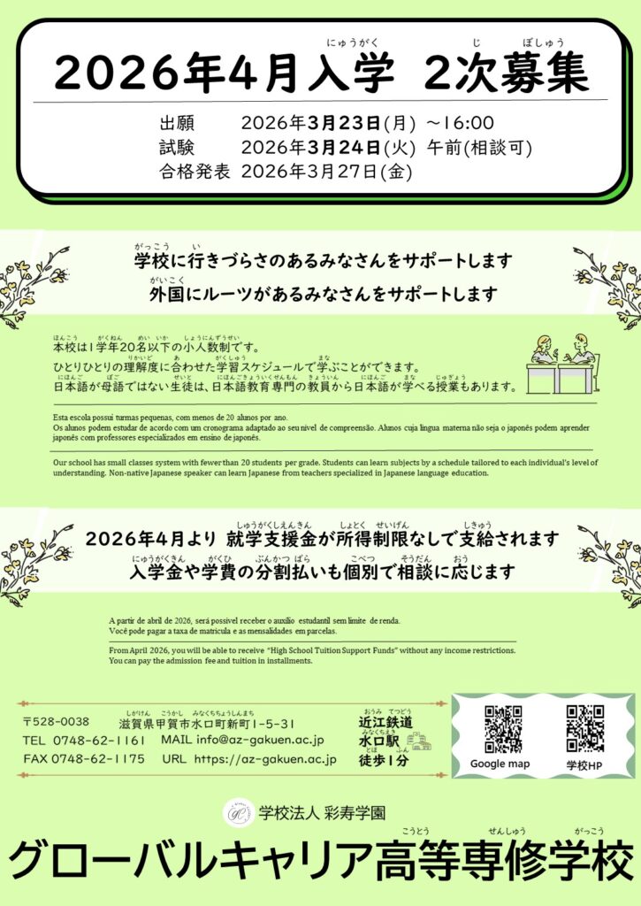 2026年度入学 2次募集のお知らせ